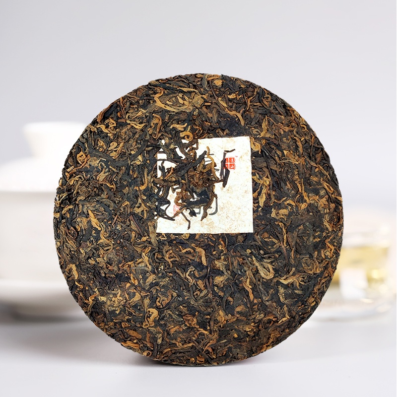 Crafted via stone-grinding pressing, the tea cake is round and plump in shape. Its surface reveals golden buds, each with a thick, full bud head, and the overall color presents a rich brown hue that shimmers with a natural luster.