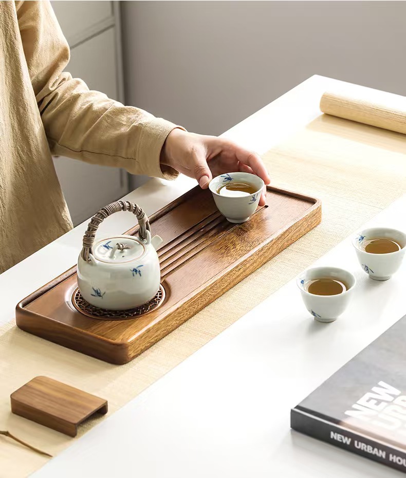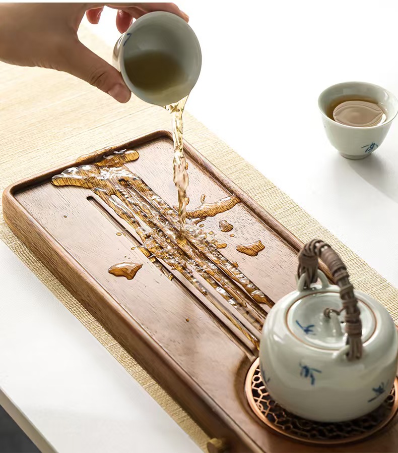 Walnut wood – Durable and sturdy: This wholesale walnut wood tea tray is carved from a single piece of wood (no joints or compressed boards). Meticulous craftsmanship ensures high stability and durability, with little risk of deformation or cracking. It meets tea shops’ bulk procurement of long-lasting solid wood tea trays and enterprises’ demand for high-quality durable tea accessories, helping wholesale clients reduce after-sales issues and improve customer retention.